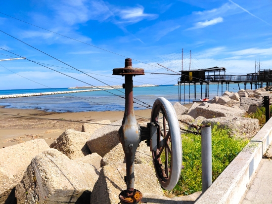 There is a story that the Traboccho were invented by Jews fleeing persecution in northern Europe. Since they had no experience in fishing boats, they created platforms with a series or wooden arms, winches & pulleys, and ropes to lower nets into the water and pull up fish. This complicated mechanism needed at least three men (pervasive misogyny dogma said women were bad luck) to operate; one to spot the schools of fish and the others to move and lower the net.